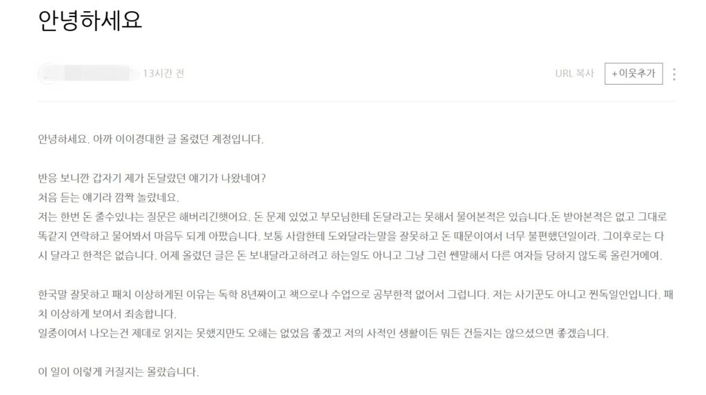 그는 해당 DM이 사실이라고 말하기 위해, 실제 이이경 인스타그램에서 “메시지”를 눌러 들어가는 영상을 게재했으며, 또 자신을 독일인 여성이라고 밝히며, “한국어 독학 8년째. 돈을 요구하거나 협박한 적 없다”는 입장을 내놓았습니다.